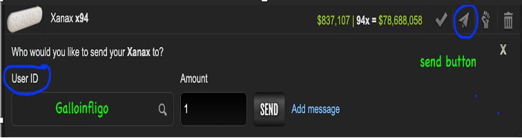 • Type in the UserID section either MIA[131289] (plushies and flowers) or GalloInfligo[2133394] (drugs and temps).